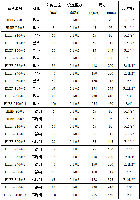主要特点: 1.为背压阀的两端管路提供压力差 2.防止虹吸现象发生,消除投加点压力波动所引起的投加量变化 3.和脉动阻尼器配合使用减少水锤对系统的危害 4.保护管路、弯头、接头,减小压力波动的冲击 5.与其他管路元件如脉动阻尼器等配合使用才能发挥大效用 尺寸规格表 多种壳体材质可选: 塑料:PTFE、PP、UPVC、PVDF 金属:304、316、碳钢、铝合金、哈氏合金